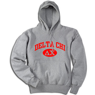 Delta Chi vertical arc printed unisex/men's sized hooded sweatshirt comes with the design as shown. You can choose your Hoody color and print color below.