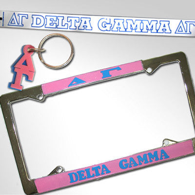 This special package is exclusively for Delta Gamma and includes everything you need for your car! (1) Delta Gamma License plate (1) Delta Gamma letter keychain (1) Delta Gamma car decal. Rush service is available for a fee of 15% of total.