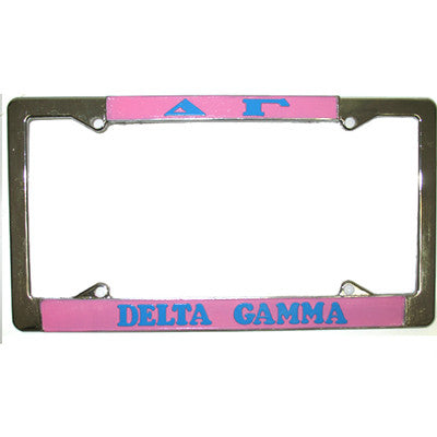 Delta Gamma license plate frame comes as shown. These frames are metal. Rush service is available for 20% of the total price, and can be selected during checkout.