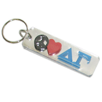 This Delta Gamma Peace Love Keychain comes exactly as shown. There is a mirrored background on both the front and the back of the keychain. Rush service is available for 15% of the total price, this service can be selected during checkout.