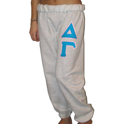 These sweatpants are made specifically for Delta Gamma Sorority. Sweatpants come with 4-inch twill sewn-on Delta Gamma Greek letters going down the left leg. These sweatpants are Unisex/Men's Sized - please click on the sizing chart below if you have any questions.