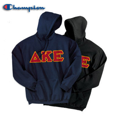 Get 2 of our best selling Champion Sweatshirts for a special discounted price. Sweatshirts can both be customized and will come with Delta Kappa Epsilon Greek letters sewn on the front in 4-inch twill. Champion Unisex/Men's Sized 9-ounce hooded fleece sweatshirt. 50% cotton, 50% polyester; Lycra enhanced trim; two-ply hood; front pouch with bartacks for durability; ribbed waistband; C logo at left cuff. Rush service is available for 15% of the total price, this service can be selected during checkout.