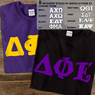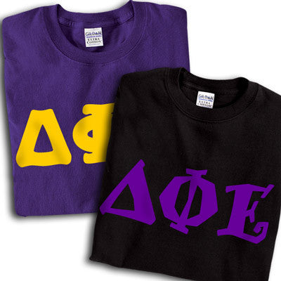Get 2 Delta Phi Epsilon printed t-shirts for almost the same price as getting one! 8 fonts and multiple colors to choose from. Gildan 5.3oz. 100% cotton, preshrunk t-shirts. Double-needle stitching throughout, seamless topstitched collar, taped neck and shoulders. Ash color is 99% cotton, 1% polyester, Sports Grey color is 90% cotton, 10% polyester, Heather Cardinal, Dark Heather and Heather Indigo are 50% cotton and 50% polyester. Rush service is available for 15% of the total price, this option is available during checkout. This is a PRINTED item. This item does NOT have sewn on twill letters. Any questions, please contact customer service.