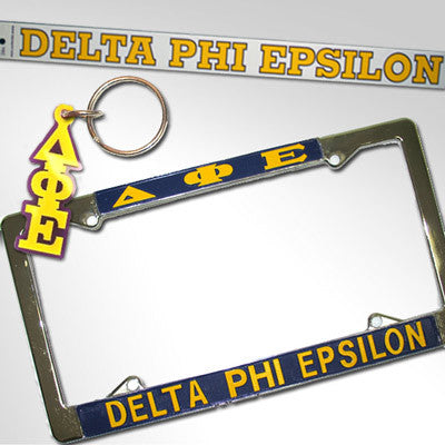 This special package is exclusively for Delta Phi Epsilon and includes everything you need for your car! (1) Delta Phi Epsilon License plate (1) Delta Phi Epsilon letter keychain (1) Delta Phi Epsilon car decal. Rush service is available for a fee of 20% of total.
