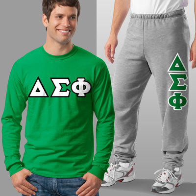This package comes with the Gildan longsleeve with 4 inch twill letters going across the chest and Jerzees sweatpants with 4 inch twill letters going down the left leg. Both items will come with the Delta Sigma Phi greek symbols.