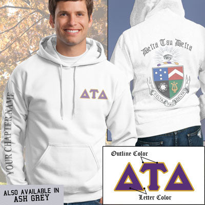 This sweatshirt features the Delta Tau Delta crest in full color printed on the back of the hooded sweatshirt. Delta Tau Delta will be written out arced over the top in Black in the Old English Font. On the right sleeve of the sweatshirt you can have your chapter written out in Black and the Old English font to match the back of the sweatshirt. On the left chest the Delta Tau Delta greek symbols will be used and printed in 2-inches. Please select your letter color and outline color below. This sweatshirt only comes in White or Ash Grey. This is a printed garment, it does not have sewn on letters.