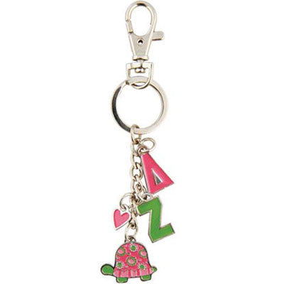 Delta Zeta Charm Keychain comes in your Sororities' colors and has your organizations' letters and mascot dangling. 4 Separate enamel charms; length is approximately 3.5 inches. Rush service is available for 20% of the total price, this service can be selected during checkout.