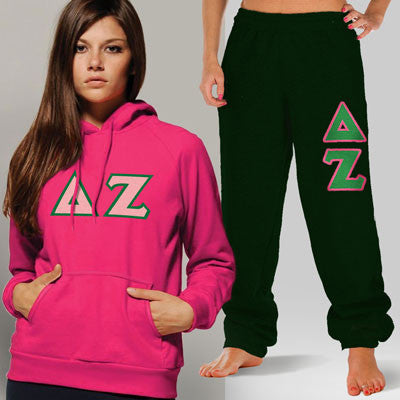 This sewn-on twill letter package is perfect for any Delta Zeta sister. Package comes with the Gildan Hooded Sweatshirt with 4-inch twill sewn-on letters on the front and the Jerzees Sweatpants with 4-inch twill letters going down the left leg. Both garments are unisex/men's sized - there is a sizing chart link below. Both items will come with Delta Zeta in Greek Symbols.