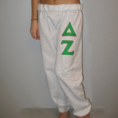 These sweatpants are made specifically for Delta Zeta Sorority. Sweatpants come with 4-inch twill sewn-on Delta Zeta Greek letters going down the left leg. Due To Licensing Restrictions From Your National - we cannot place letters on the butt. These sweatpants are Unisex/Men's Sized - please click on the sizing chart below if you have any questions.