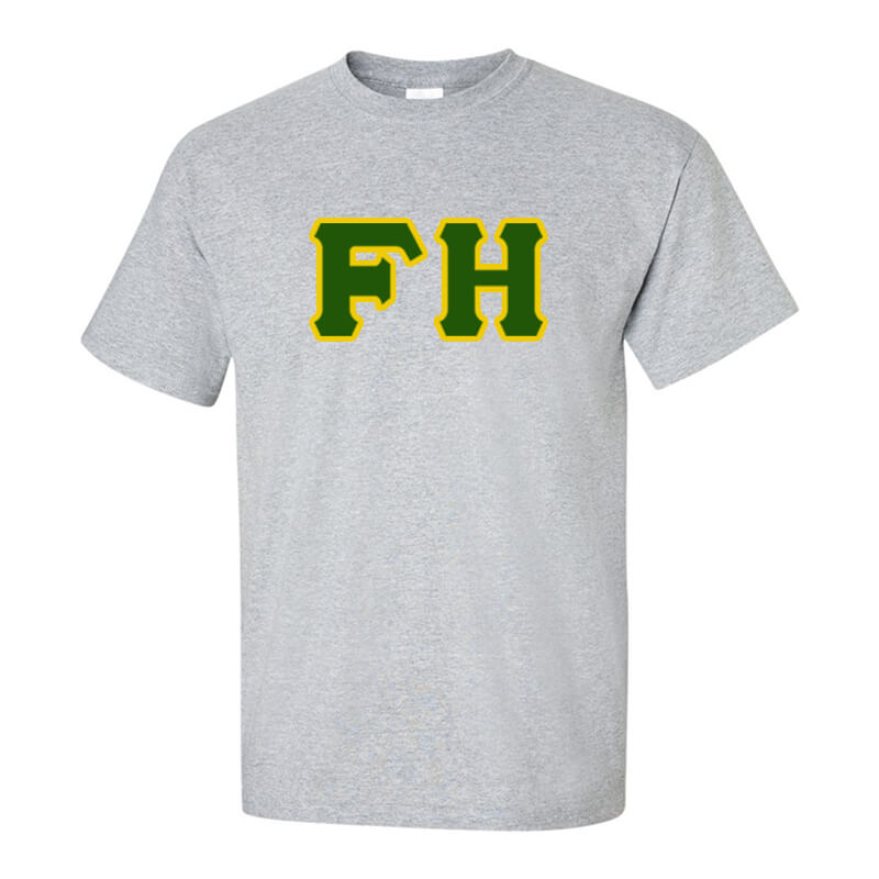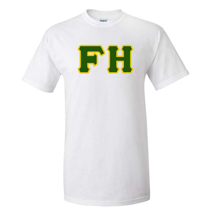 T-Shirt will come with sewn-on twill Greek letters for Farmhouse. We have selected your letter color / border color (pictured) for you in order to offer you these great savings.