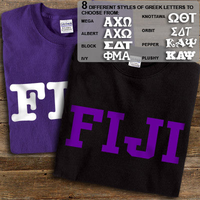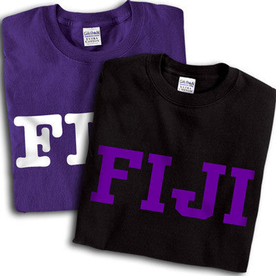 Get 2 FIJI printed t-shirts for almost the same price as getting one! 8 fonts and multiple colors to choose from. Gildan 5.3oz. 100% cotton, preshrunk t-shirts. Double-needle stitching throughout, seamless topstitched collar, taped neck and shoulders. Ash color is 99% cotton, 1% polyester, Sports Grey color is 90% cotton, 10% polyester, Heather Cardinal, Dark Heather and Heather Indigo are 50% cotton and 50% polyester. Rush service is available for 15% of the total price, this option is available during checkout. This is a PRINTED item. This item does NOT have sewn on twill letters. Any questions, please contact customer service.