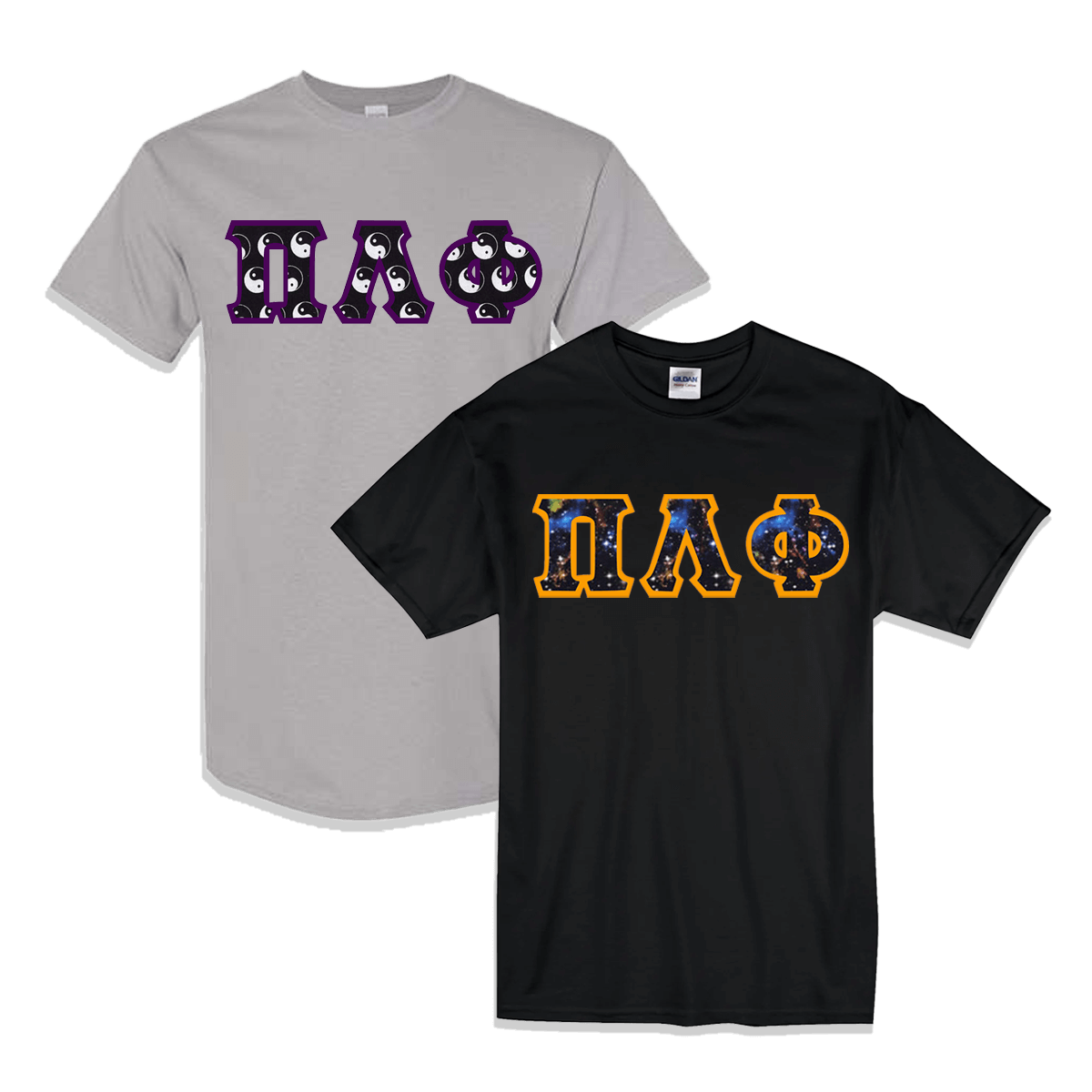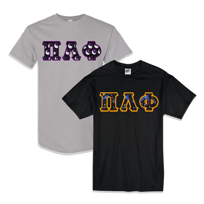 Get 2 T-shirts with 4-inch twill sewn-on letters on the front. 6.1 oz., Gildan, preshrunk 100% cotton-unless otherwise noted on dropdown, Unisex/Men's Sized Ultraweight T-shirts. Shirts come with your Fraternities' Greek Symbols placed on the front. Rush service is available for 20% of the total price, this option is available during checkout.