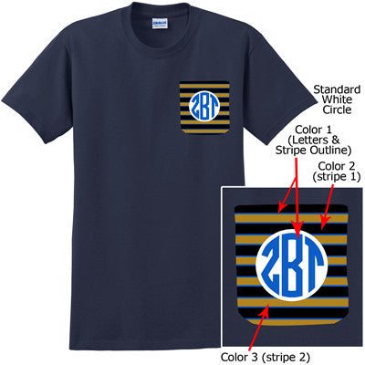 New Custom Pocket T-Shirt that features a stripe design printed on the custom made crocket with your Fraternities' Greek Symbols printed in a circle monogram font. The custom pocket is sewn onto the left chest and is a functional pocket. Just select a T-Shirt color and size. This is a unisex/men's sized T-Shirt. Color 1 will be used for the Letter Color and Stripe Outline, Color 2 will be used for one of the Stripe Colors and Color 3 will be for the other Stripe Color. Please write out the full Fraternity name below - we will always use the Greek Symbols on this product. If you have any questions, please contact Customer Service.