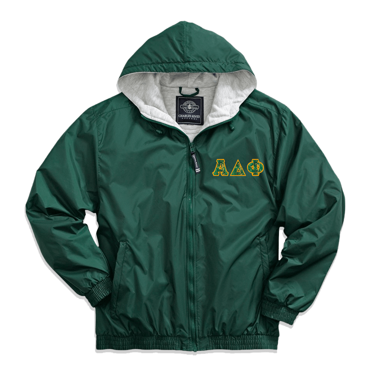 Jacket Features: Charles River Apparel brand jacket; wind and water-resistant River Tec nylon; ash grey sweatshirt liner is 9oz/yd-squared; drawstrings at hood; zippered pockets; elasticized cuffs and waistband.