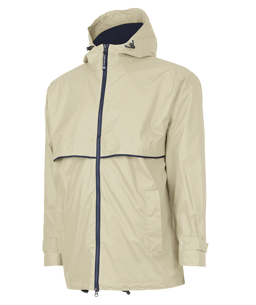 Rain Jacket Features: Charles River Apparel brand jacket; wind and waterproof New Englander Polyurethane bonded to a woven backing; mesh and nylon lined; heat-sealed seams; front vented capes; hood and hem with shockcord drawstring; velcro cuffs; zippered pockets; 2-way front zipper; unisex/men's sizing.