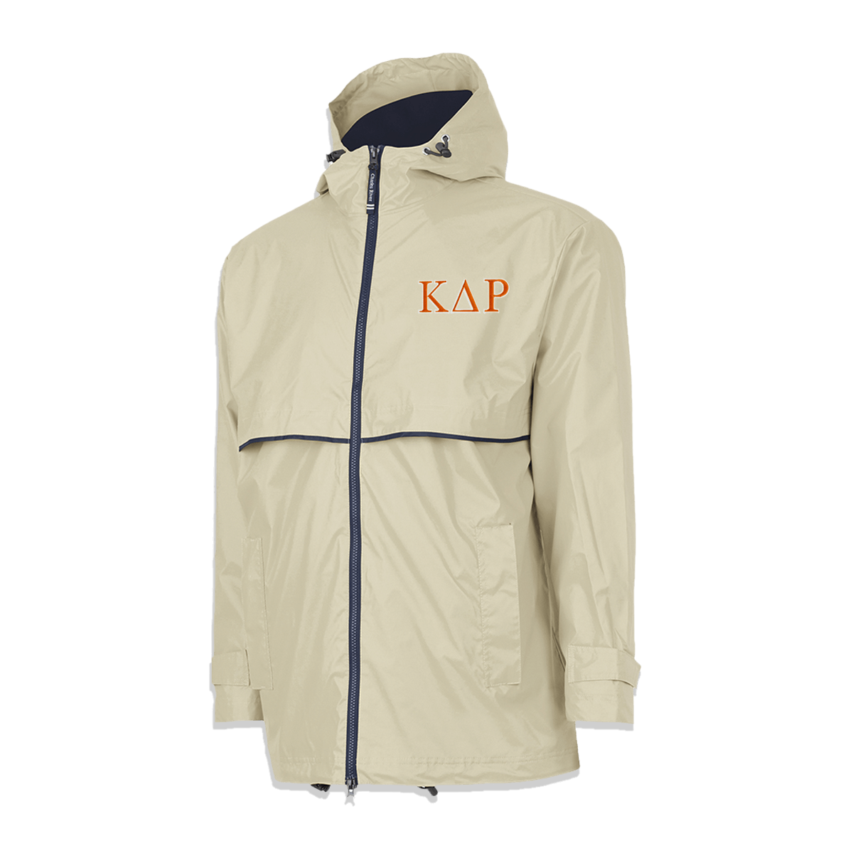 This Fraternity New Englander rain jacket comes with your Fraternities' Greek symbols embroidered on the left chest in two colors. Please select an inside color and an outline color for the embroidered Greek Letters. This jacket will come with the Greek symbols, just select your Fraternities' Symbols on the dropdown. This jacket is wind and waterproof and sized for men.