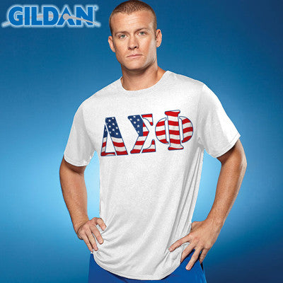 Please select your Fraternity Greek Symbols on the drop down list, and we will use the Greek Symbols in the Full Color Flag Design Shown. This is a printed garment and only available in White.