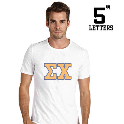 This multi-color printed, lettered Fraternity T-Shirt is friendly both on your skin and wallet. This tee only comes in White and features your Fraternities' Greek Symbols on the front. You get to pick your Letter Color and Border Color. The Letter size is 5-inches. Please write out the full Fraternity name below--we will only use the Greek Symbols on the shirt in the font that is shown. This is a printed Unisex/Men's sized Tee.