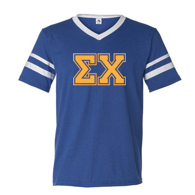 This Greek Varsity Letter striped sleeve v-neck jersey t-shirt comes with your organizations' Greek symbols printed in the Varsity Letter font shown in 5-inches and will be placed on the front of the shirt. This is a PRINTED item, it does not have twill sewn-on letters. Please select your organizations Greek letters above - we will only use the Greek symbols on the t-shirt. This is a UNISEX/MEN'S SIZED tee.