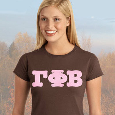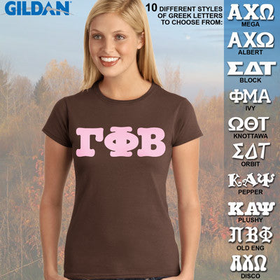 This Gildan ladies' tee is made up of the brand new Soft Style material and comes with the Gamma Phi Beta Greek symbols printed across the front in 3-inches in the font of your choice. This is a printed item and does NOT have twill letters.