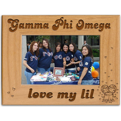 Gamma Phi Omega Sorority love my Lil Frame comes exactly as shown. Dimensions of frame are 5 inches x 7 inches, it holds a 4x6 picture, walnut wood with an easel back and glass window front. Frames can hang or stand, horizontally. Rush service is available for 15% of the total price, this service can be selected during checkout.