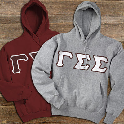 Gamma Sigma Sigma hoodies come with 4 inch twill Greek letters sewn on the front. Gildan 7.75oz unisex/men's sized hooded sweatshirts, 2 for this low price! 50% cotton and 50% polyester. Rush service is available for a fee of 15% of the total price, this service can be selected during checkout.