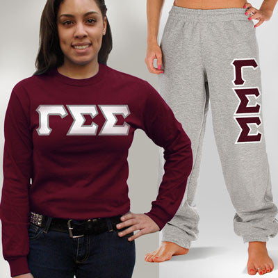 This package comes with the Gildan unisex/men's sized longsleeve with 4 inch twill letters going across the chest and Jerzees unisex/men's sized sweatpants with 4 inch twill letters going down the left leg or 4 inch twill letters on the butt. Both items will come with the Gamma Sigma Sigma greek symbols.