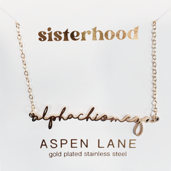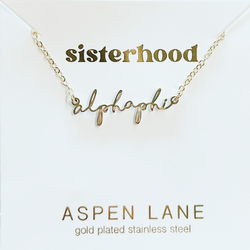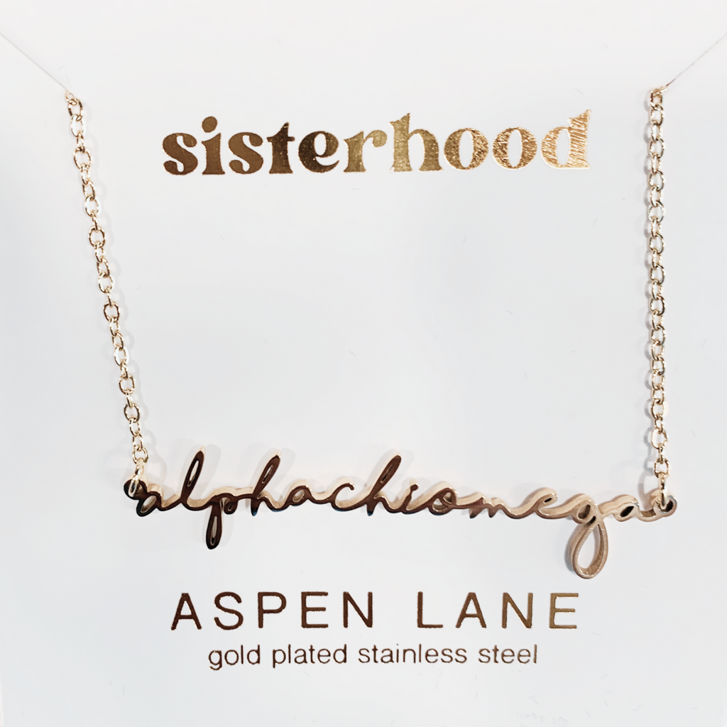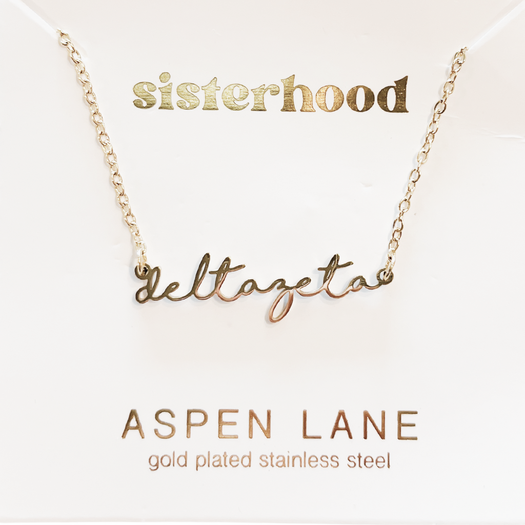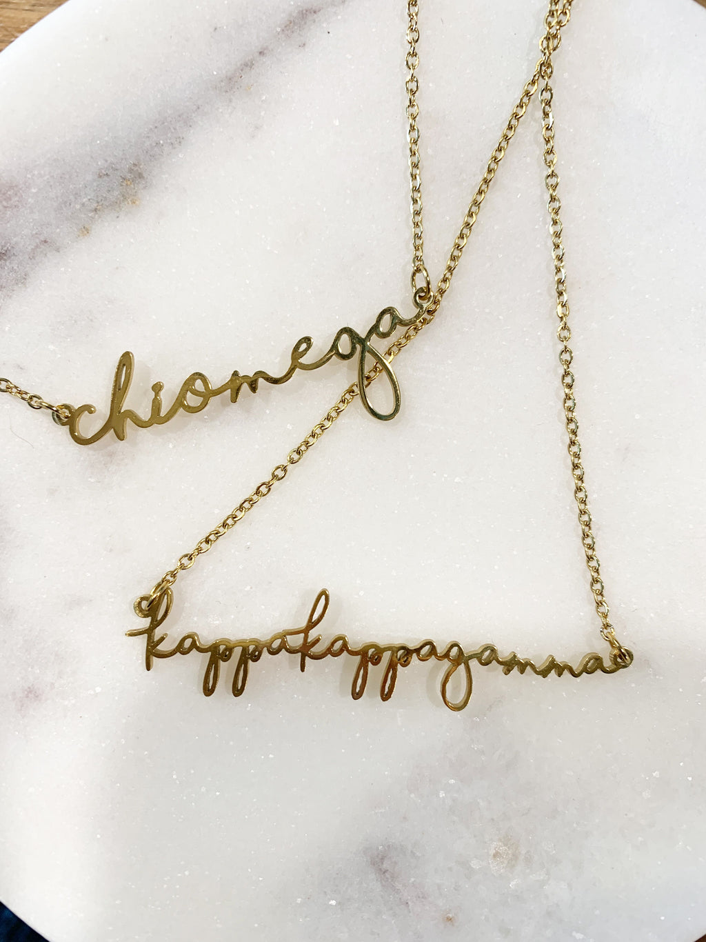 This beautiful Gold Script Sorority Necklace is expertly crafted from durable gold-plated metal. The Greek letters are precision-etched in a stylish script font. Enjoy wearing your sorority necklace for years of continuous use and admiration, all at an unbeatable price.