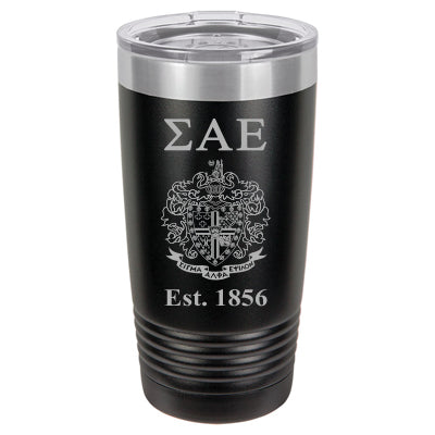 Keep your liquids insulated in style, with this black tumbler featuring your crest and organization. This tumbler holds 20 ounces. Tumbler comes with your organizations' crest and has your Greek letters above the crest and your organizations' established date below the crest, as pictured here. Dimensions: 7.25 inches. Rush service is available for 15% of the total price, this option is available during checkout.
