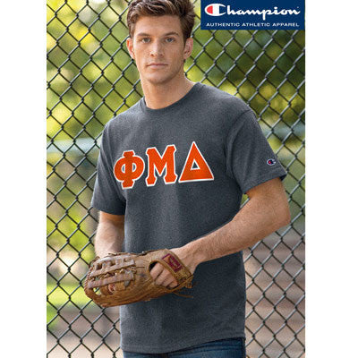 This Champion brand tee is made of 100% preshrunk heavyweight cotton. We will customize this garment with ANY twill Greek letters you request.