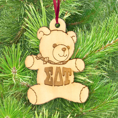 Sorority laser-engraved teddy bear ornament with Greek letters. This ornament can be made for any organization. Just write out your organizations' name below, and your Greek letters will be used and placed where shown in the picture. Ornament is Natural Basswood and is approximately, 3.5 inches. Rush service is available for 15% of the total price. This service can be selected during the checkout process.