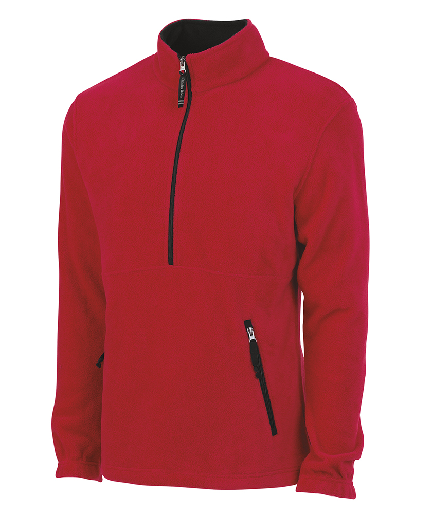 Fleece Pullover Features: Charles River Apparel brand; anti-pill Loftex fleece; unlined; 8.85-ounce / yd-squared; stand-up collar with black accent; black zippers; elastic cuffs; open hem with shockcord drawstring; zippered pockets.