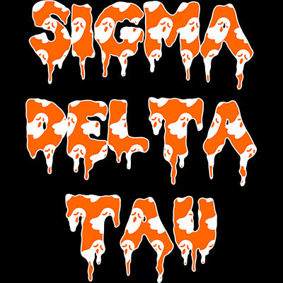 This T-shirt is Something Greek's Halloween limited edition, digital design that is only available in the style as shown above--any color Gildan 5000 blank with all-over ghost pattern on an orange background, encased in Greek fraternity or sorority organization name. Please select your fraternity's or sorority's Greek organization name.