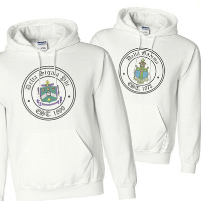 This crest sweatshirt comes with your Organizations' full color crest printed on the front of the hooded sweatshirt. Your organization will be spelled out in Black ink on the top line in the Old English font and below that it will feature your organizations' Crest in full color. The bottom line will display your Established Date in Black ink and Old English Font to match the top. This hoody is only available for the groups listed. If your organization is not listed and are interested in ordering the sweatshirt - please contact Customer Service. This is a printed garment, it does not have sewn on letters.