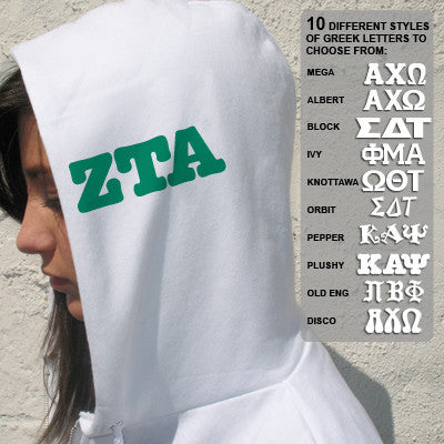 You can print the greek letters for your organization, chapter or class, to the left side or right side of the hood on your garment. Two inch greek letters will be used, up to 3 letters only, on the left or right side of the hood in the color and font of your choice. The placement will be as shown in the picture. Choosing this option will add 2-3 business days to the delivery time of your order.
