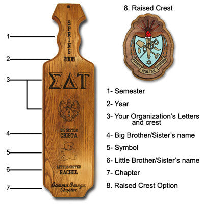 Branded paddle comes in the specifications that you supply. 1 - Select your semester first. 2 - Type in your year. 3 - Choose your organization from the dropdown. 4a - Select the prefix you would like to use. 4b - Type in your Big Brother / Sister name. 5 - Choose a symbol from the dropdown, all symbols can be viewed by clicking on the link below. 6a - Select the prefix you would like to use. 6b - Type in your Little Brother / Sister name. 7 - Write out your chapter. 8 - You can add a raised crest in color for an additional $6.95, if you select NO, then your crest will be engraved directly into the paddle. Paddle is 21 inches x 5.5 inch oak Paddle. We can do local groups as well! If your organization is not listed please email Art@SomethingGreek.com with a copy of your crest and select Local Group on the drop-down AFRER you place your place your order. Please include the Order # in the subject line of your email.. Rush service is available for a fee of 15% of total.