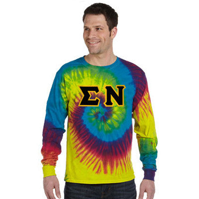 This Greek tie-dyed long-sleeve t-shirt comes in a variety of colors with 4-inch twill sewn-on Greek letters across the chest. Please select the full fraternity or sorority name above--we will always use Greek symbols on the garment.