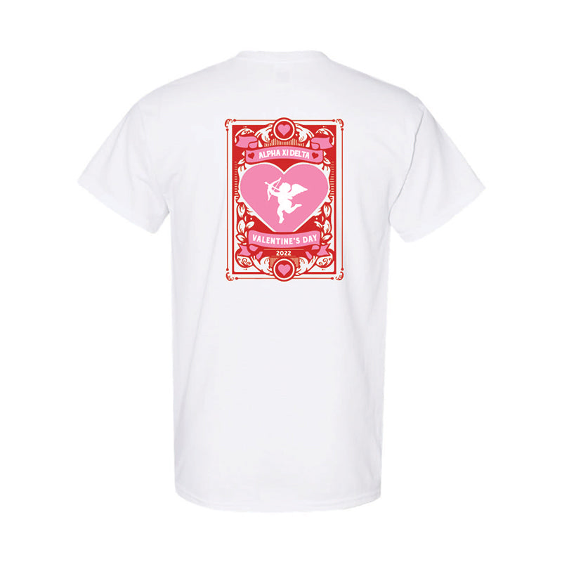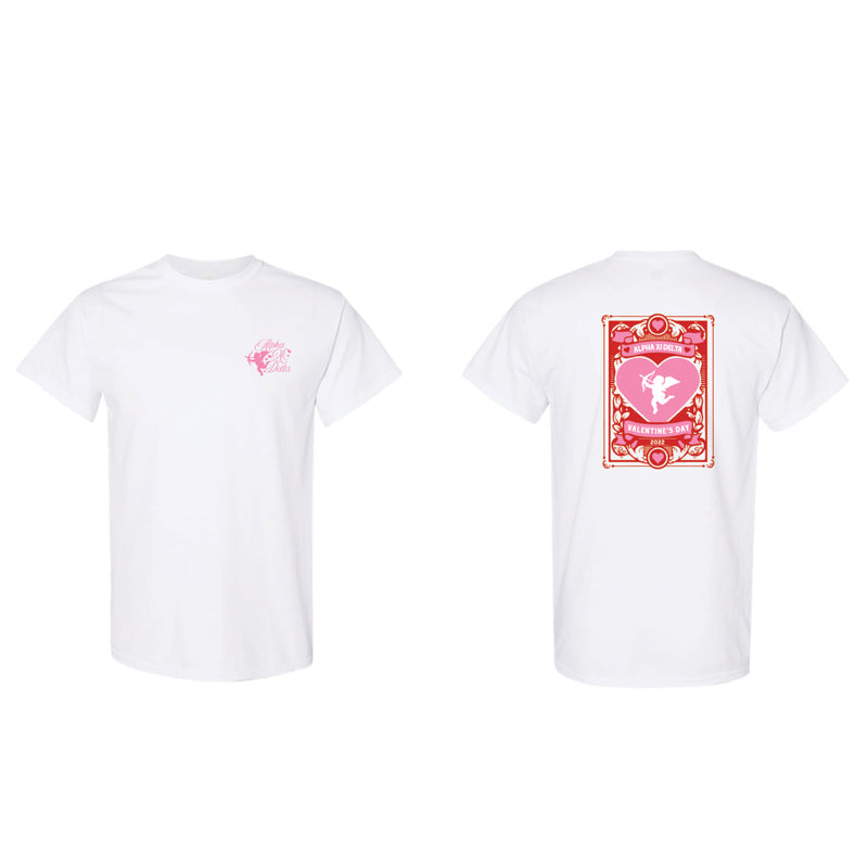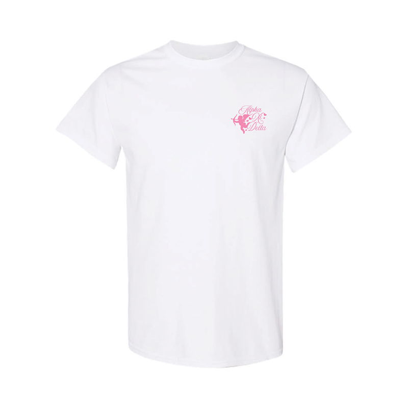 This Tee comes with a cupid looking for love along with your Greek organization name on the front left chest. On the back this shirt has a large portrait of cupid inside a pink heart and your custom sorority or fraternity name on the top. Please select the shirt color and enter your Greek organization name above. Please note that print color may vary due to the garment dye.