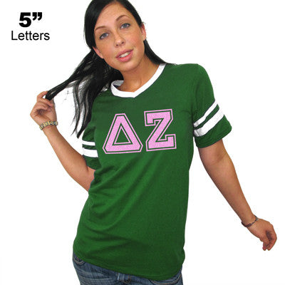 This Greek Varsity Letter striped sleeve v-neck jersey t-shirt comes with your organizations' Greek symbols printed in the Varsity Letter font shown in 5-inches and will be placed on the front of the shirt. This is a PRINTED item, it does not have twill sewn-on letters. Please select your organizations Greek letters above - we will only use the Greek symbols on the t-shirt. This is a UNISEX/MEN'S SIZED tee.