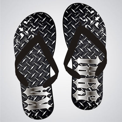 Brand New Product Exclusive To Something Greek, these Diamond Plate Printed Flip-Flops come with the Kappa Alpha greek symbols on the left flip flop as shown and the right flip flop will display the date you input. Comes in sizes Small - XL, and they are made of rubber.