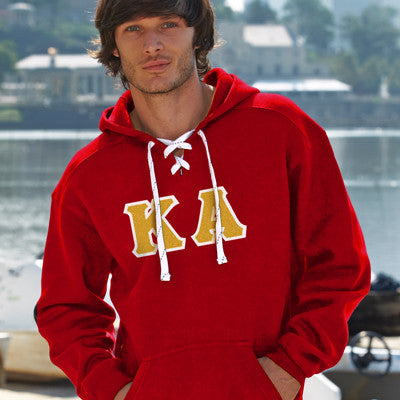 This sport laced hockey hooded sweatshirt comes with the Kappa Alpha Greek symbols in 4-inch twill sewn-on letters across the chest. Comes with white laces and an extra set in the color of your choice! This is a Unisex/Men's sized garment - if you have any questions please click on sizing chart below.