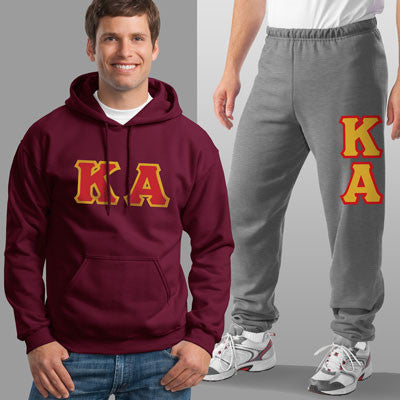 This sewn-on twill letter package is perfect for any Kappa Alpha Fraternity member. Package comes with the Gildan Hooded Sweatshirt with 4-inch twill sewn-on letters on the front and the Jerzees Sweatpants with 4-inch twill letters going down the left leg. Both garments are unisex/men's sized - there is a sizing chart link below. Both items will come with Kappa Alpha in Greek Symbols.
