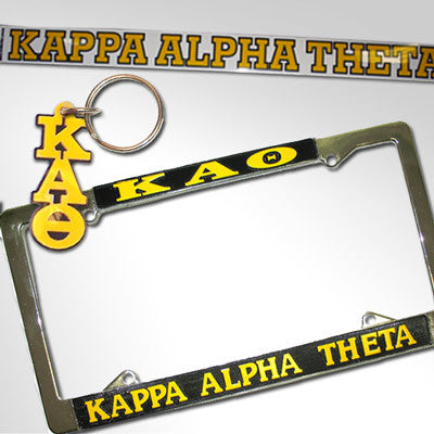 This special package is exclusively for Kappa Alpha Theta and includes everything you need for your car! (1) Kappa Alpha Theta License plate (1) Kappa Alpha Theta letter keychain (1) Kappa Alpha Theta car decal. Rush service is available for a fee of 15% of total.