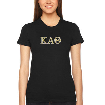 Kappa Alpha Theta ladies fitted tee comes with your Greek letters embroidered on the center chest. 100% superfine cotton, 4.8 oz. 3/4 inch set-in collar; shoulder-to-shoulder taping; 3/4 inch sleeve and bottom hem. Rush service is available for 20% of the total price, this option is available during checkout. Comes with your choice of two color embroidery.