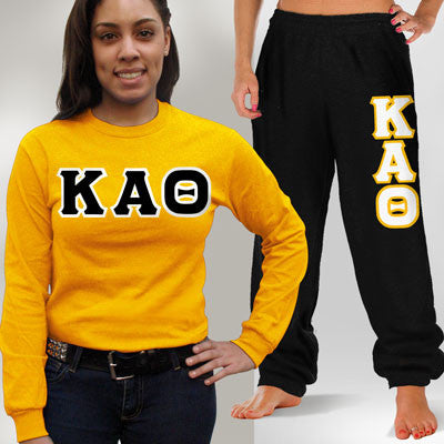 This package comes with the Gildan unisex/men's sized longsleeve with 4 inch twill letters going across the chest and Jerzees unisex/men's sized sweatpants with 4 inch twill letters going down the left leg or 4 inch twill letters on the butt. Both items will come with the Kappa Alpha Theta greek symbols.