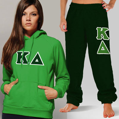 This sewn-on twill letter package is perfect for any Kappa Delta sister. Package comes with the Gildan Hooded Sweatshirt with 4-inch twill sewn-on letters on the front and the Jerzees Sweatpants with 4-inch twill letters going down the left leg. Both garments are unisex/men's sized - there is a sizing chart link below. Both items will come with Kappa Delta in Greek Symbols.