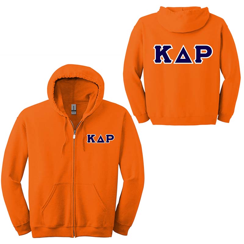 Customize our best-selling Greek Full-Zip Unisex Hoodie with your Kappa Delta Rho letters! Choose from over 450+ different Greek letter twill designs, colors and patterns. You can choose to have custom 2" Greek Letters across the left chest, 4" Greek Letters across the upper back, or both placements!