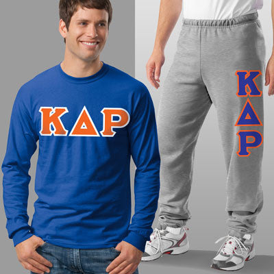 This package comes with the Gildan longsleeve with 4 inch twill letters going across the chest and Jerzees sweatpants with 4 inch twill letters going down the left leg. Both items will come with the Kappa Delta Rho greek symbols.