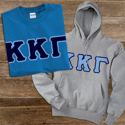 Kappa Kappa Gamma hoody / t-shirt pack comes with 4 inch twill Greek letters sewn on the front of both garments.Hoody: Gildan 7.75oz unisex/men's sized hooded sweatshirt, 50% cotton and 50% polyester. T-Shirt: Gildan 5.3oz unisex/men's sized t-shirt, 100% cotton, preshrunk. Rush service is available for a fee of 15% of the total price, this service can be selected during checkout.