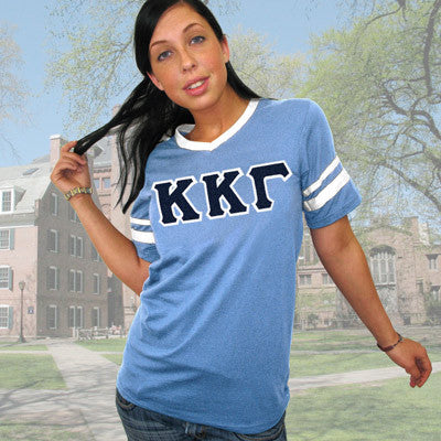 This Greek striped sleeve v-neck jersey t-shirt comes with Kappa Kappa Gamma greek symbols on the front in 4-inch twill sewn-on letters. This is a UNISEX/MEN'S SIZED tee.